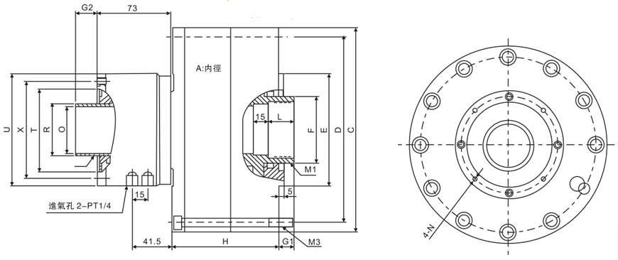 Large through hole with double pistons design, strong pulling force, it’s suitable for long axis workbar machining.