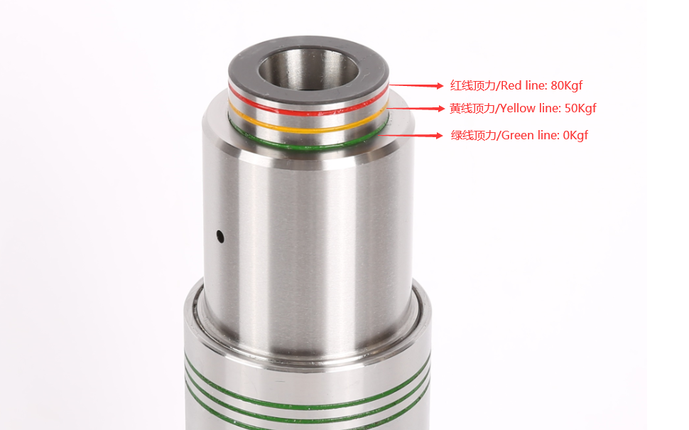 顏色刻度:當顏色刻度線與頂針前端固定平面齊平時,紅線頂力:80Kgf/黃線頂力:50Kgf/綠線頂力:0Kgf