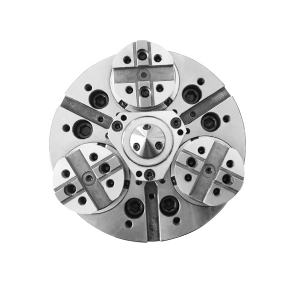 An internal floating cam makes it possible to clamp on the standard center hole even when the outer diameter of a work piece is not centered.