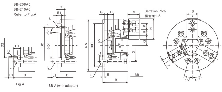 | BB-215 A15 | M155×2 | 6-M24 | 35 | 38 | 63 | 165 | 43 | 93.5 | 85.7 | 43.75 | 18.25 | 62 | 22 | 3-M12 |