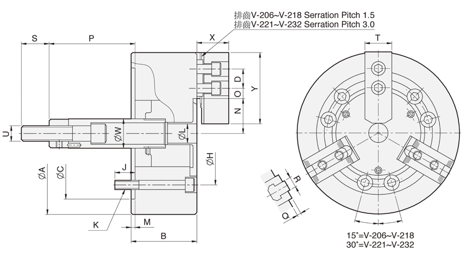*注:V-212另有齒距為3.0*60度的規(guī)格;Note: The serration pitch 3.0*60 degree is available for V-212 model