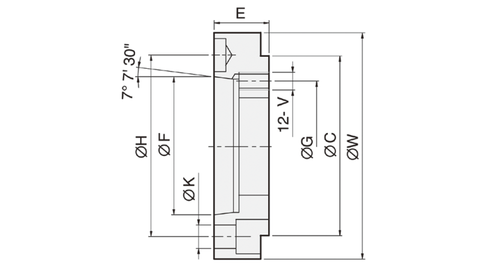 | 型式尺寸 | 主軸鼻端 | C | F | H | K | G | V | W | E | 適合夾頭 |
